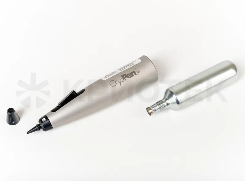 Cryodevices CryoPen | C (option b+) with three multi-heads for different area treatment. Works from disposable cartridges of 23.5 g of nitrous oxide (-89°C). Provides high quality and precision machining of surfaces up to 1 mm. Ideal for treatment of warts on the hands, feet and genitals.