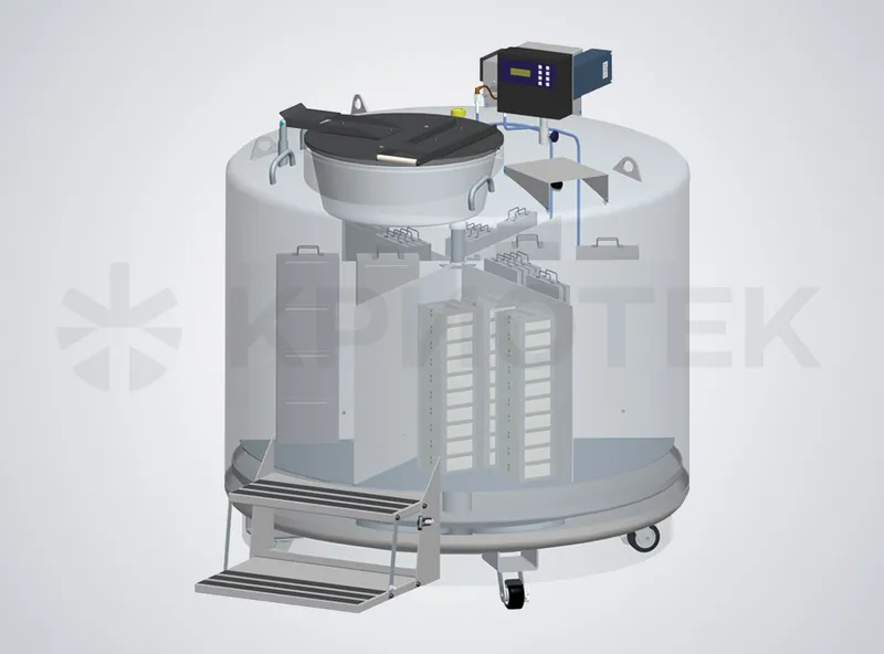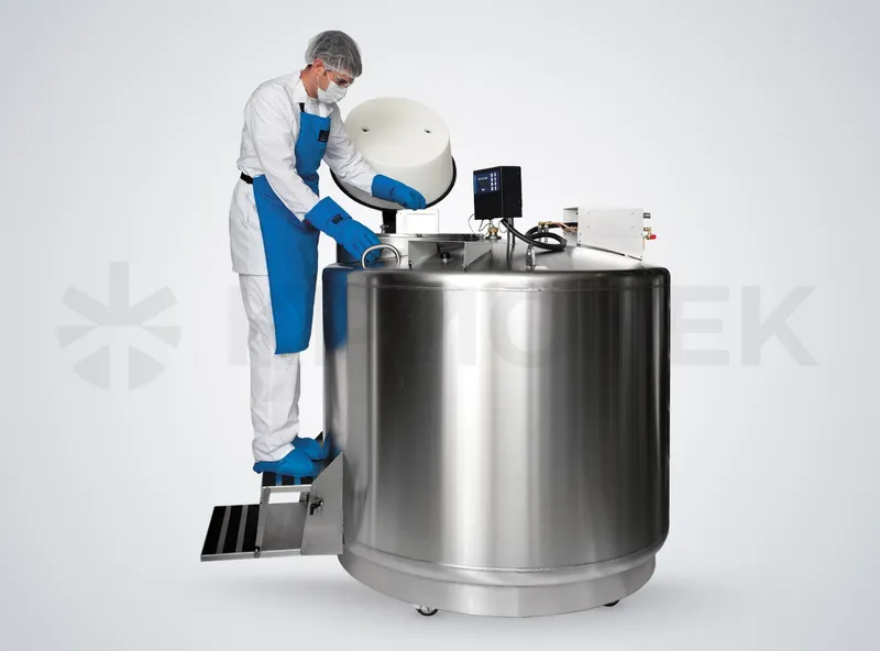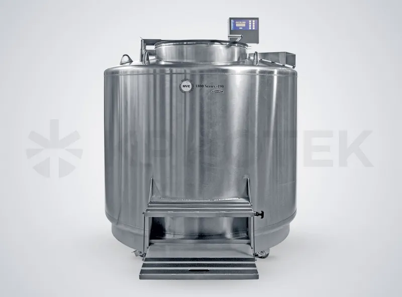 The MVE HE 1879 P-190 cryostore holds up to 79950 1.2 / 2.0 ml vials and provides the highest density of biomaterial placement and the longest storage time.