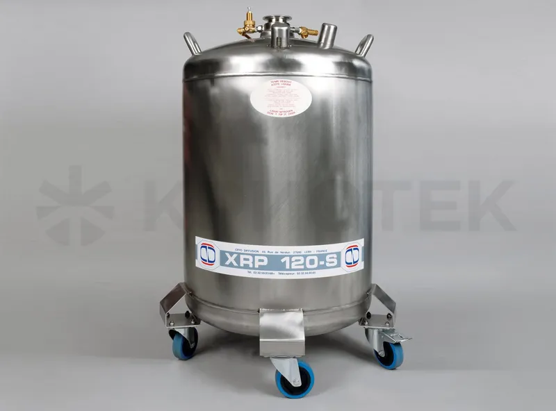 Vertical vessel XRP 120 with a capacity of 127 liters under pressure up to 1.5 bar for storage and delivery of liquid nitrogen and argon. It is a "vessel in a vessel" made of non-magnetic stainless steel. Equipped with flange Pneurop NW 50, with internal diameter of a neck 50 mm, which fixes the head of the fluid transfer device TAP, equipped with a pressure regulator, pressure gauge and safety valve. The vessel is usually supplied with a plug. For laboratory and industrial applications.
